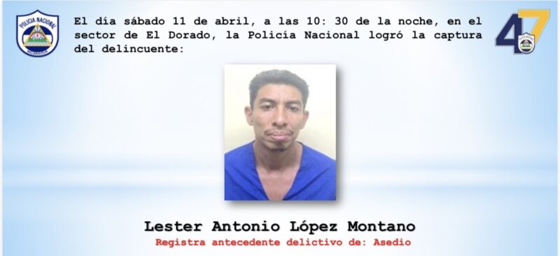 La Policía Nacional informó sobre la captura de Lester Antonio López Montano, de 37 años, señalado como autor de un robo con intimidación ocurrido en el barrio Costa Rica, Distrito 4 de Managua.