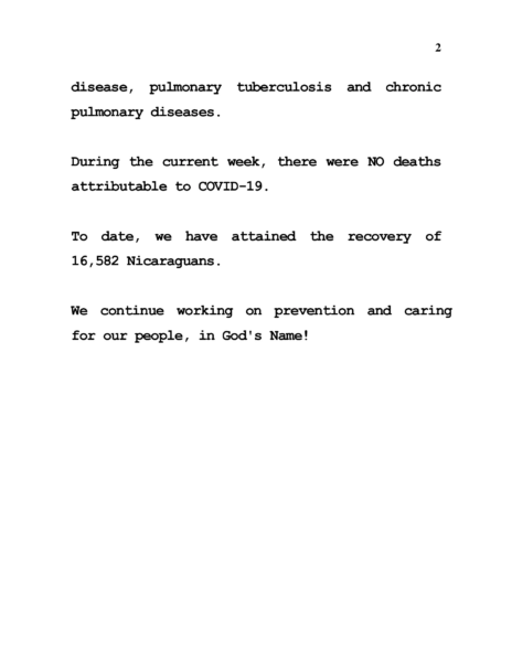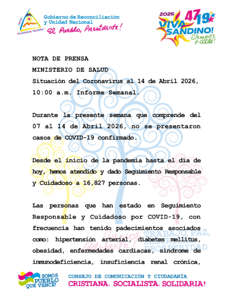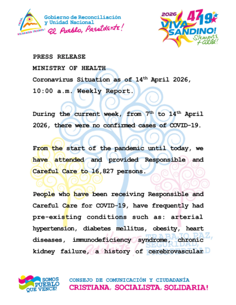 El Ministerio de Salud de Nicaragua informó que hasta la fecha no se han registrado contagios positivos de Covid-19 en el país, manteniendo las cifras oficiales en cero y destacando las medidas de vigilancia epidemiológica que continúan en marcha.