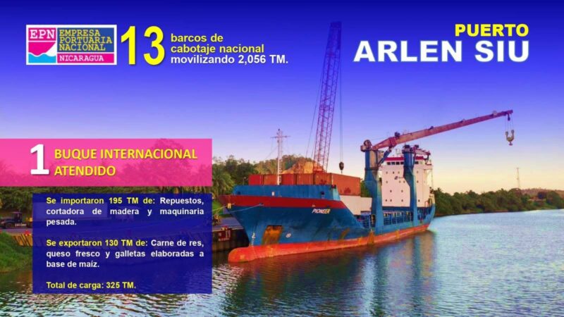 En el puerto Arlen Siu, ubicado en el Caribe Sur, se manejaron 325 toneladas métricas entre importaciones de repuestos y maquinaria, así como exportaciones de carne de res, queso y productos derivados del maíz. También se atendieron tres embarcaciones de cabotaje nacional con más de 2,000 toneladas métricas movilizadas.