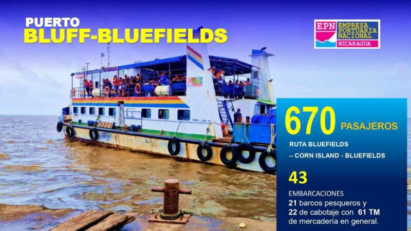 Por su parte, en Bluefields se atendieron 43 embarcaciones nacionales, incluyendo barcos pesqueros y de cabotaje, con 61 toneladas métricas de carga, además de 670 pasajeros en rutas locales. En Puerto Cabezas se registró la atención de 35 embarcaciones con 167 toneladas métricas de mercadería y mariscos.