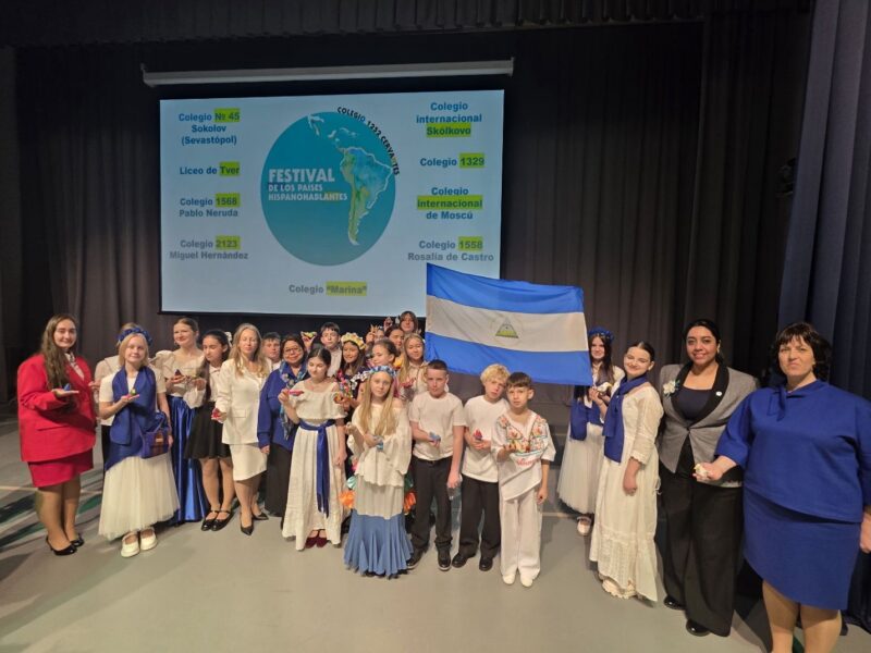 Este 24 de Abril en Moscú, en el que celebramos el Victorioso Mes de la Paz, los niños y niñas de la Escuela Nº 45 V.I. Sokolov de la ciudad Heroica de Sebastopol, han representado la riqueza cultural de Nicaragua en el Festival de la Cultura de los Países Hispanohablantes. En este proyecto intercultural participaron 10 colegios de las ciudades de Moscú, Tver y Sebastopol.